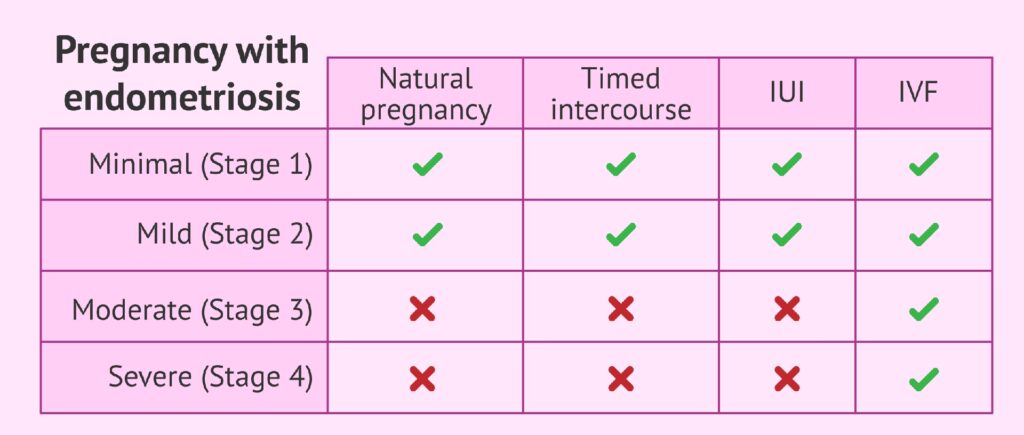 For nogle kvinder er smerterne så invaliderende, at det er nødvendigt at fokusere på smertebehandling først. Dette kan involvere hormonbehandling som p-piller eller en hormonspiral, der sætter sygdommen i bero, men som også forhindrer graviditet. I sådanne tilfælde er det en afvejning mellem livskvalitet her og nu og det fremtidige graviditetsønske. Når smerterne er under kontrol, kan man i samråd med sin læge planlægge en pause i behandlingen for at forsøge at blive gravid.