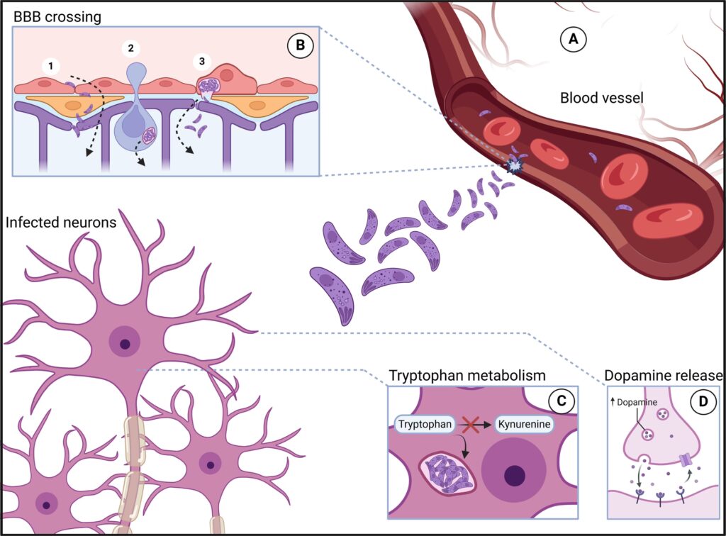 - Dopaminsystemet: T. gondii kan påvirke produktionen og omsætningen af dopamin. Da uregelmæssigheder i dopaminsystemet er en af grundpillerne i forståelsen af skizofrenis positive symptomer (som hallucinationer og vrangforestillinger), er dette en stærk potentiel mekanisme.