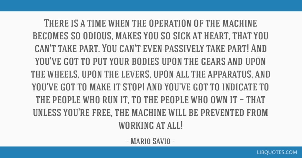 His climactic words about "the operation of the machine" have been quoted widely ever since, out of context, as the existential emblem of the FSM. (Or mis-quoted, since he said "passively" rather than "tacitly.")