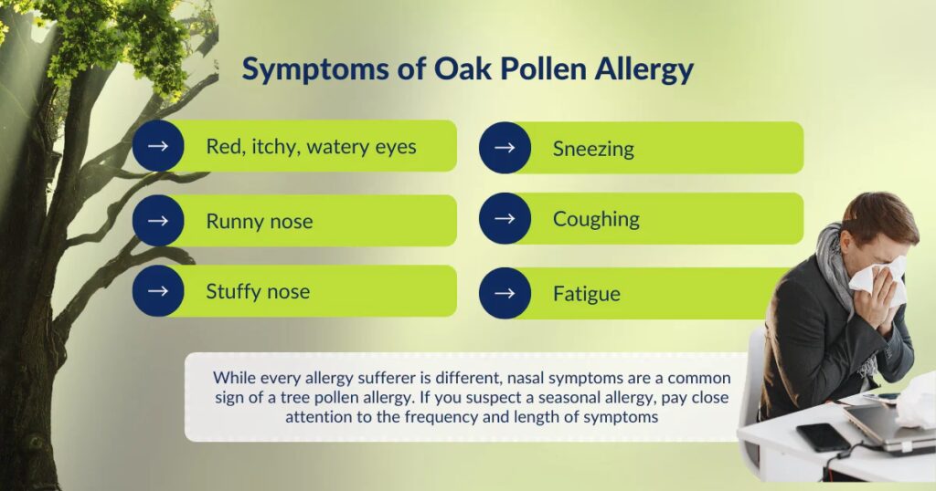 Symptomerne kan variere i sværhedsgrad fra person til person, men de mest almindelige tegn på, at du reagerer på træpollen, inkluderer: