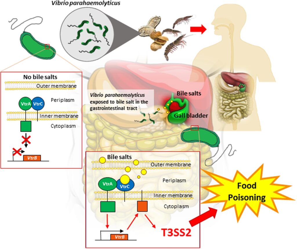 Ikke alle stammer af Vibrio parahaemolyticus er sygdomsfremkaldende. De patogene stammer, der forårsager sygdom hos mennesker, producerer typisk potente toksiner. De mest kendte er termostabilt direkte hæmolysin (TDH) og TDH-relateret hæmolysin (TRH). Disse toksiner er afgørende for bakteriens evne til at forårsage gastroenteritis, da de skader cellerne i tarmvæggen og fører til den karakteristiske vandige diarré. Forskere har identificeret mange forskellige serotyper af bakterien (baseret på O- og K-antigener på bakteriens overflade), hvoraf nogle, som O3:K6, O4:KUT og O10:K4, er blevet forbundet med større sygdomsudbrud rundt om i verden.