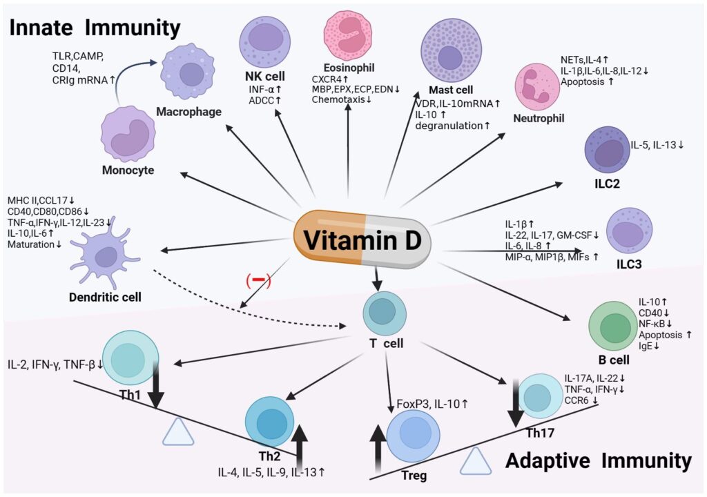 Men D-vitaminets rolle stopper ikke ved skelettet. Forskere har opdaget, at der findes D-vitaminreceptorer på næsten alle celler i kroppen, herunder cellerne i vores immunsystem. Dette indikerer, at vitaminet har en langt bredere funktion end tidligere antaget. Det spiller en afgørende rolle i at modulere immunforsvaret. Det kan både styrke immunresponset over for infektioner, som f.eks. tuberkulose, og samtidig dæmpe det for at forhindre, at det overreagerer, hvilket er kendetegnende for autoimmune sygdomme og allergiske reaktioner.