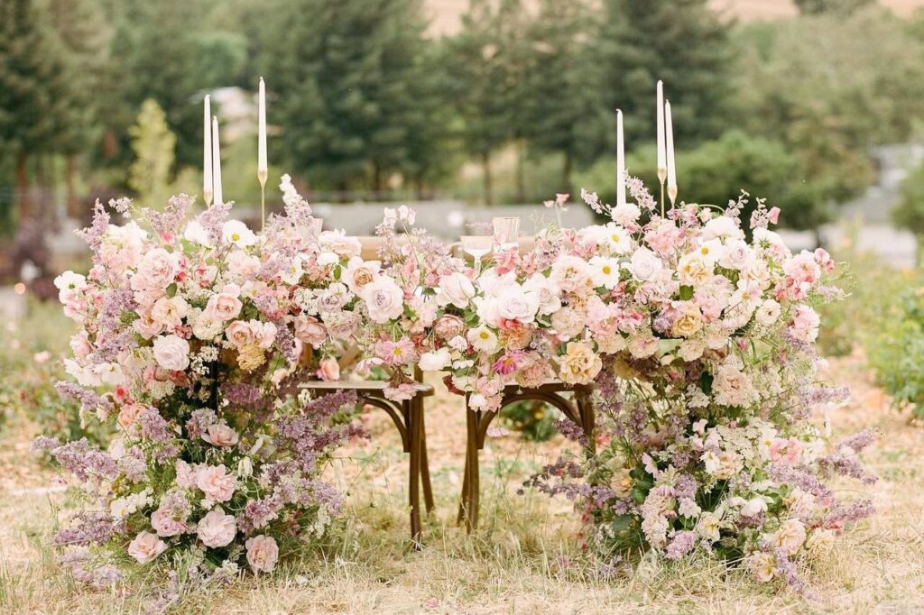 - Hængende Installationer: En af de mest imponerende tendenser er blomster og grønt, der hænger fra loftet. En blomsterlysekrone over dansegulvet eller en baldakin af grønt over bordene skaber en magisk, have-lignende følelse.