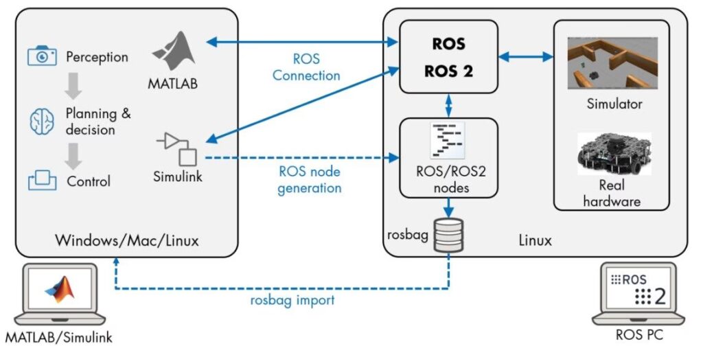 - Udvidet platformsupport og skalerbarhed: ROS 2 er designet til at understøtte komplekse systemer med flere robotter og fungerer på tværs af flere platforme, herunder mindre indlejrede systemer.