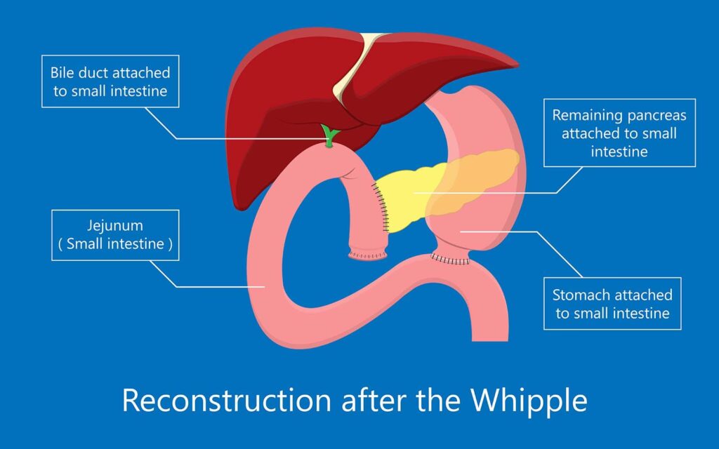 Efter at disse dele er fjernet, står kirurgen over for den mindst lige så udfordrende opgave at genopbygge fordøjelsessystemet. Dette gøres ved at skabe nye forbindelser (anastomoser) mellem de resterende organer. Den resterende del af bugspytkirtlen, galdegangen og mavesækken bliver alle syet fast til tyndtarmen (jejunum), således at fordøjelsessafter og mad igen kan passere normalt gennem systemet. På grund af de mange sammensyninger og operationens omfang er der en betydelig risiko for komplikationer, hvilket understreger vigtigheden af tæt postoperativ overvågning.