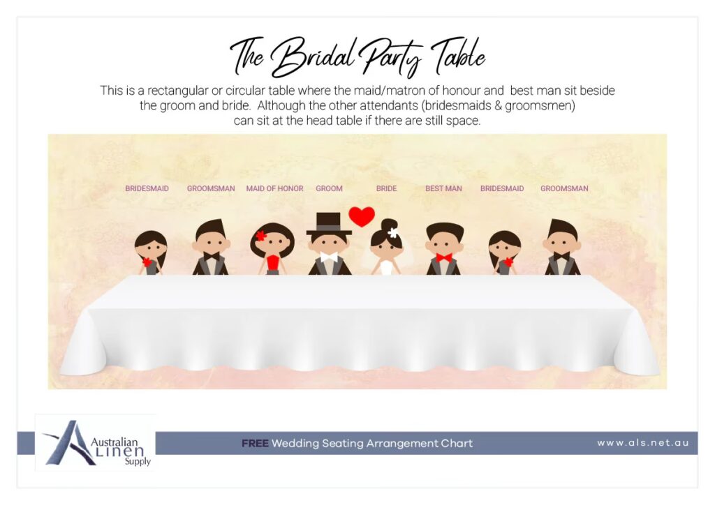 Dette er en gammel tradition, men absolut ikke en regel, der skal følges slavisk i dag. I skal sidde, som I føler jer bedst tilpas. Det vigtigste er, at I sidder sammen i midten som festens ærespersoner.
