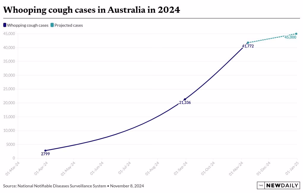 I Australien ses den højeste stigning i tilfælde blandt børn i alderen 10-14 år. Dette er en aldersgruppe, hvor immuniteten fra børnevaccinationerne kan være begyndt at aftage, og før de modtager deres teenager-booster.