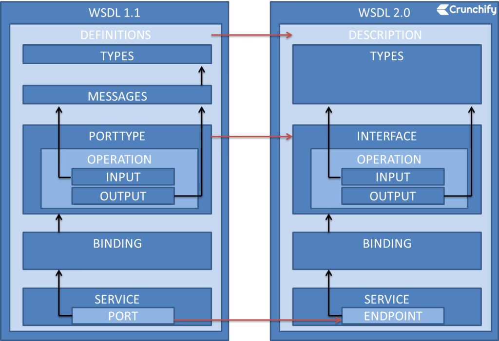 • Forenklet terminologi: Nogle af de oprindelige termer blev omdøbt for at være mere intuitive. For eksempel blev <portType> til <interface>, og <port> blev til <endpoint>.
