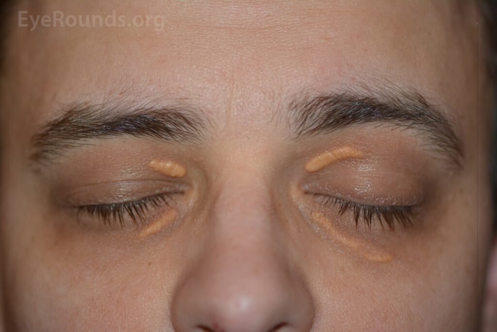 Xanthelasma er den mest almindelige form for xanthom, som er en generel betegnelse for en hudlidelse, hvor fedtstoffer aflejres lokalt i huden. De viser sig som velafgrænsede, bløde, gule til hvidlige plaques, der typisk opstår symmetrisk omkring øjnene, oftest i den indre øjenkrog på både øvre og nedre øjenlåg. Disse aflejringer består af makrofager (en type hvide blodlegemer), der har optaget store mængder lipider (fedtstoffer).