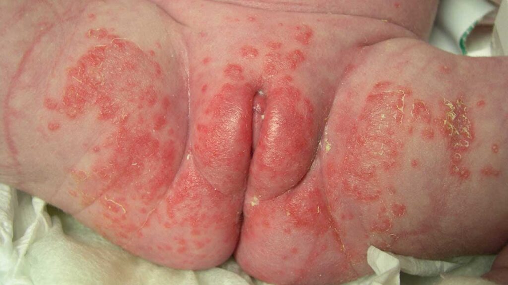 | Hudfolder eller navle | Et rødt, irriteret udslæt. Området kan have pletter, der siver med en klar væske. Der kan også opstå små bumser. Ofte ledsaget af kløe eller en brændende fornemmelse. |